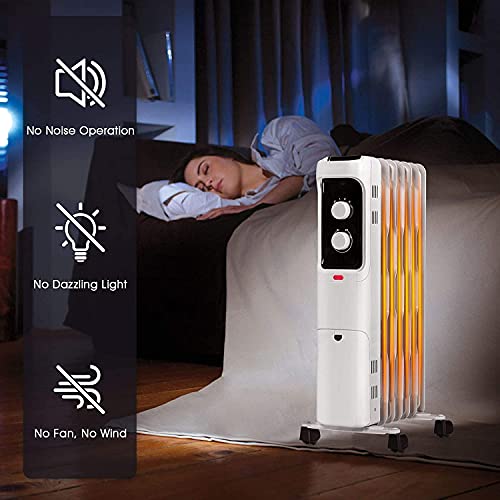 Geluidsarme ruimteverwarmer: met behulp van olie als warmtebron in plaats van een ventilator, heeft deze radiatorverwarmer een geluidsarme werking, zodat u hem tijdens het werken, slapen en ontspannen kunt gebruiken om een rustige omgeving te bieden. Bovendien maakt het compacte ontwerp het geschikt voor thuis, op kantoor en op andere plaatsen.